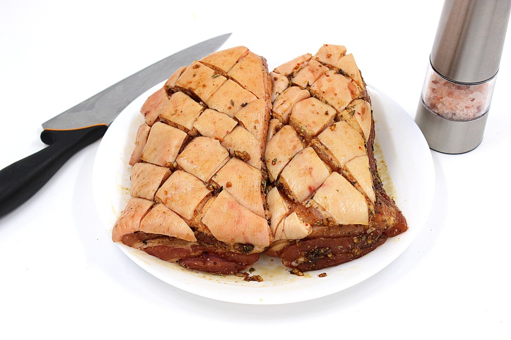 – Рекомендую выпекать при 150 °C, в течение примерно 1,5- 2 часов. Таким образом, жир медленно растворяется, и мясо становится чрезвычайно нежным.