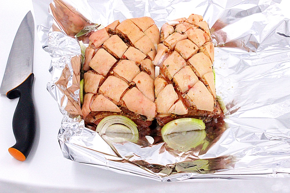 Всегда соединяю фольгу вверху, чтобы после было просто раскрыть и подрумянить мясо.