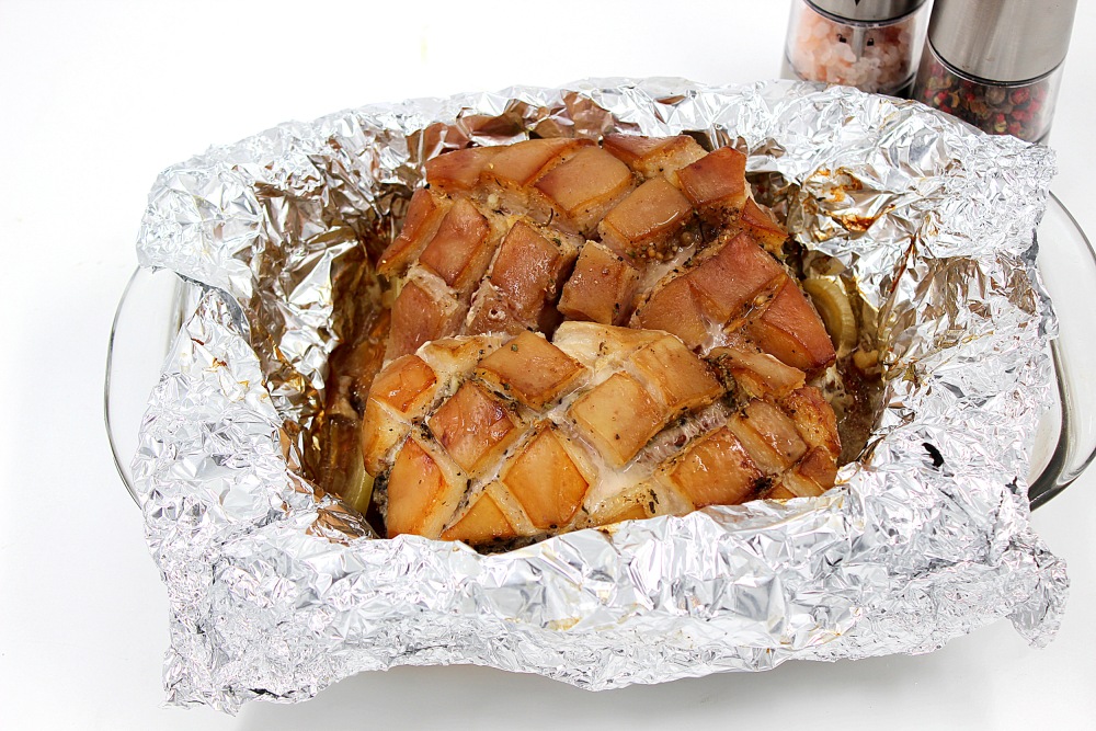 Свиная грудинка, запеченная в духовке в фольге готова.