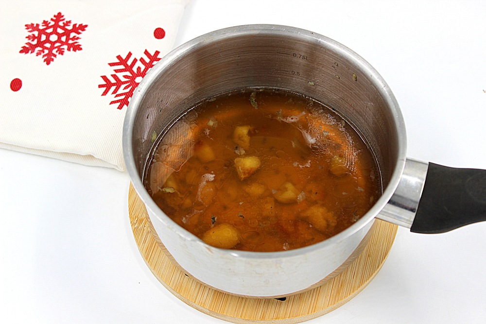 Влить бульон в сотейник к чесноку, дать закипеть и варить-выпаривать минут 15.