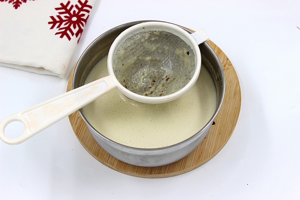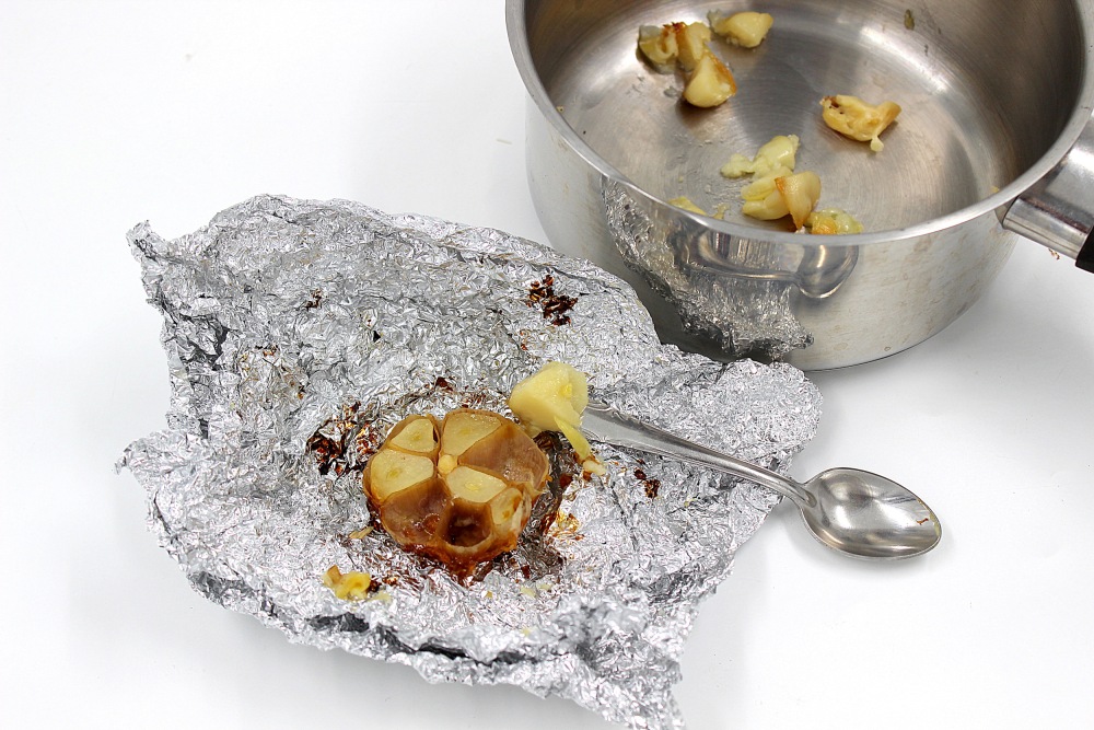 Ложечкой выбрать зубчики запеченного чеснока прямо в сотейник, в котором и будет вариться соус.