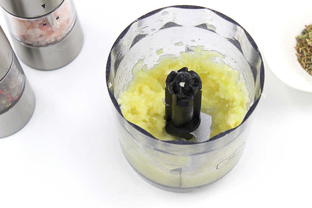 В блендер крупно нарезать лук, пол головки чеснока, влить пару ложек масла и всё измельчить.