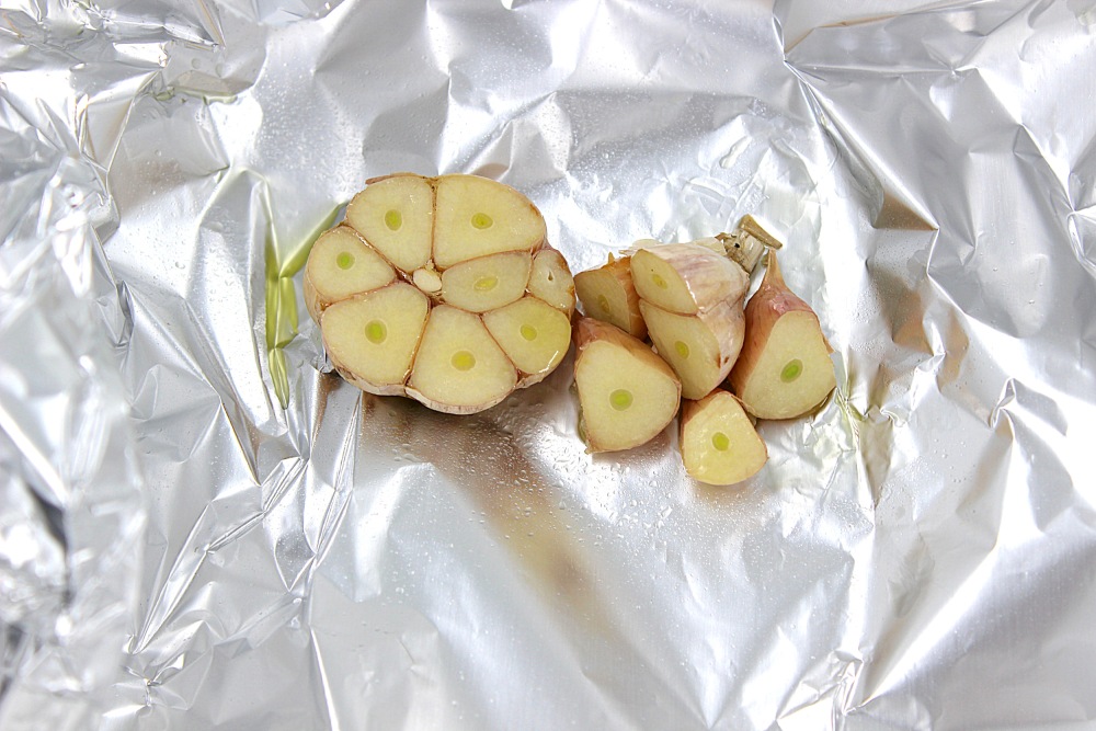 Головку чеснока аккуратно разрезать поперек, на 2 половины, поместить на фольгу и полить ложкой масла.