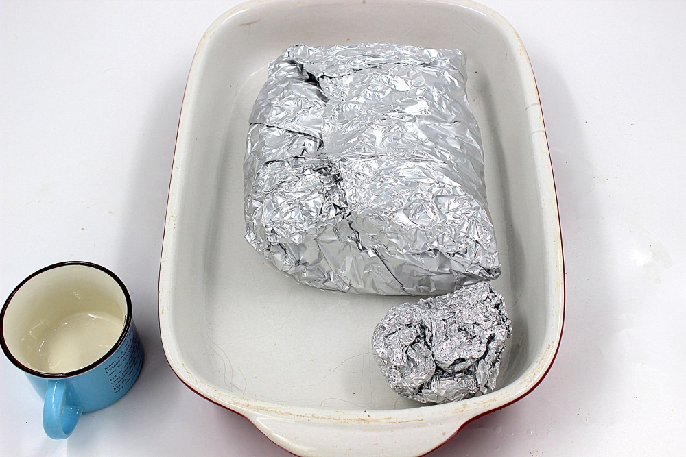 – Разогреваю в духовке, на более низкой температуре, каких 120″, в той же фольге. Обязательно добавить немного жидкости, чтобы мясо не пересыхало.