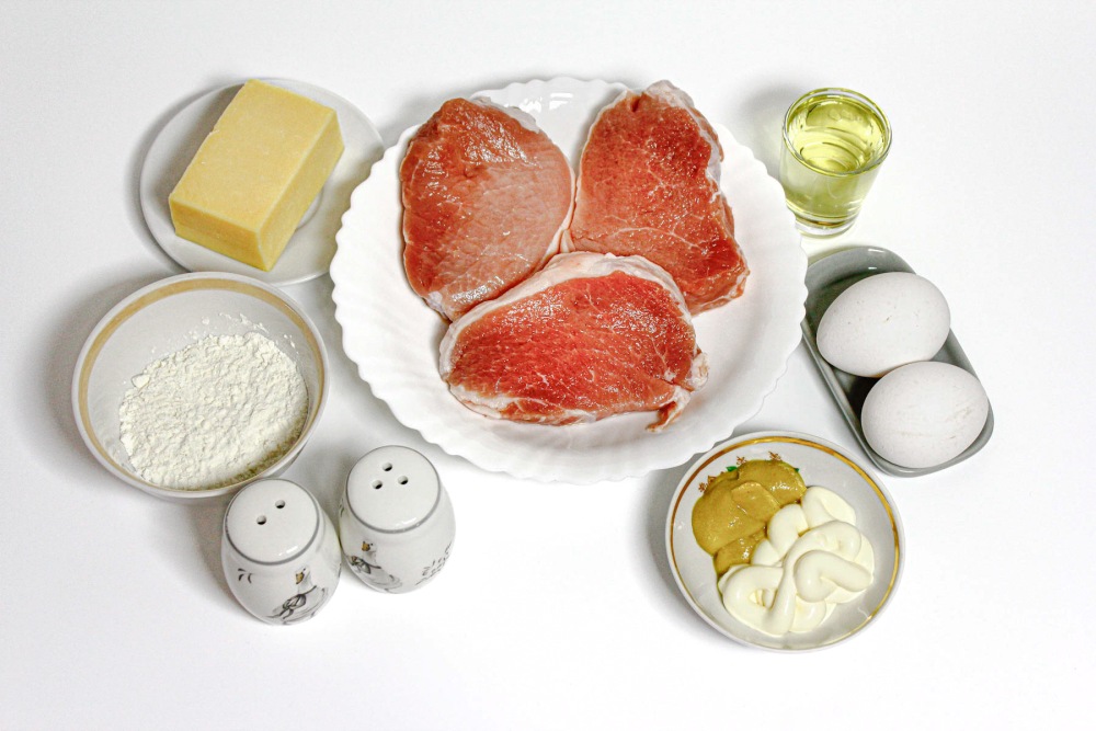 Подготовить ингредиенты для свиных отбивных. Выбрать свежую свиную корейку или шейную часть, подготовить куриные яйца, полутвёрдый сыр по вкусу (например, российский или сулугуни), майонез, немного муки для панировки, соль, чёрный перец.