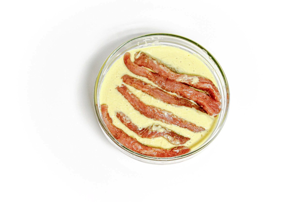 Обмакнуть мясо со всех сторон в сырный кляр, аккуратно распределить смесь по поверхности.