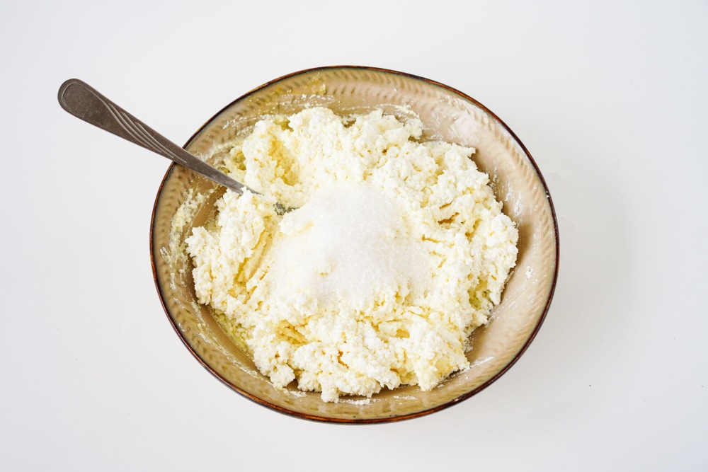 Всыпать сахар, ванилин и снова хорошо перемешать массу вилкой. Сахар должен полностью раствориться. На этом этапе можно попробовать массу и при необходимости скорректировать сладость.