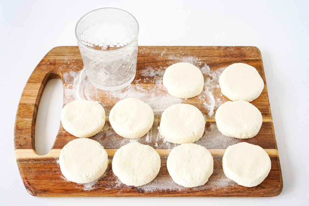 Посыпать поверхность мукой. Выложить творожную массу, слегка приплюснуть руками. С помощью стакана круговыми движениями сформировать сырники.
