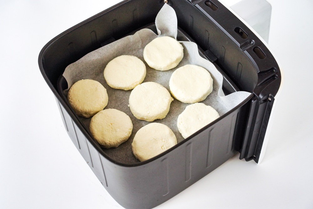 Проверить, чтобы чаша аэрогриля была чистой и сухой. При желании застелить дно пергаментом или слегка смазать поверхность растительным маслом для более румяной корочки. Аккуратно переложить сырники в чашу аэрогриля в один слой, оставляя небольшое расстояние между ними.