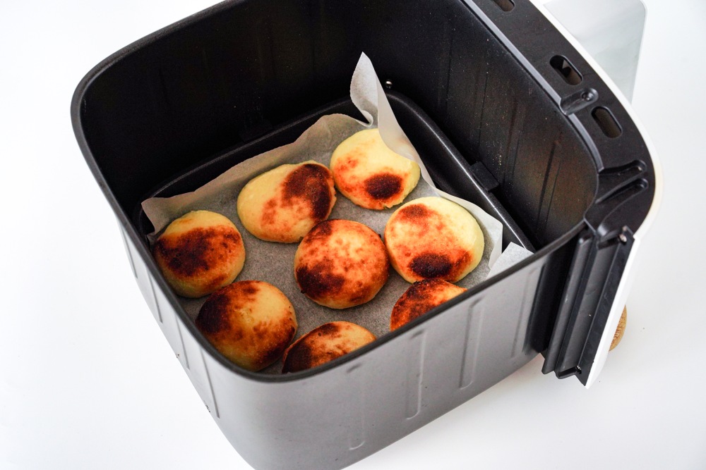 Включить аэрогриль и готовить сырники при 180 °C около 12-15 минут. По желанию можно аккуратно перевернуть сырники в середине выпекания. Достать один сырник и слегка разломить его. Внутри он должен быть мягким, но не влажным и не липким. Если серединка кажется сырой, вернуть сырники в аэрогриль ещё на 2–3 минуты.