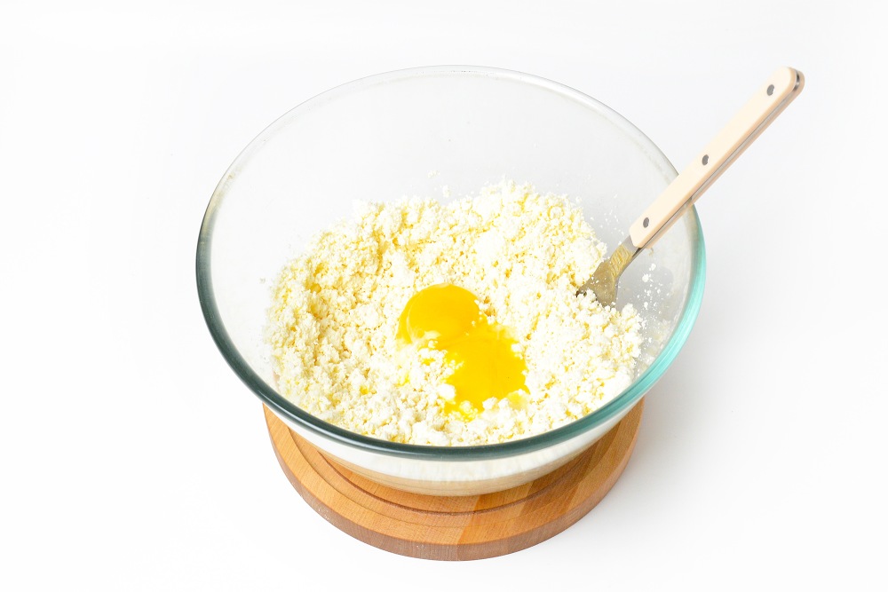 Творог слегка размять и смешать с желтками.
