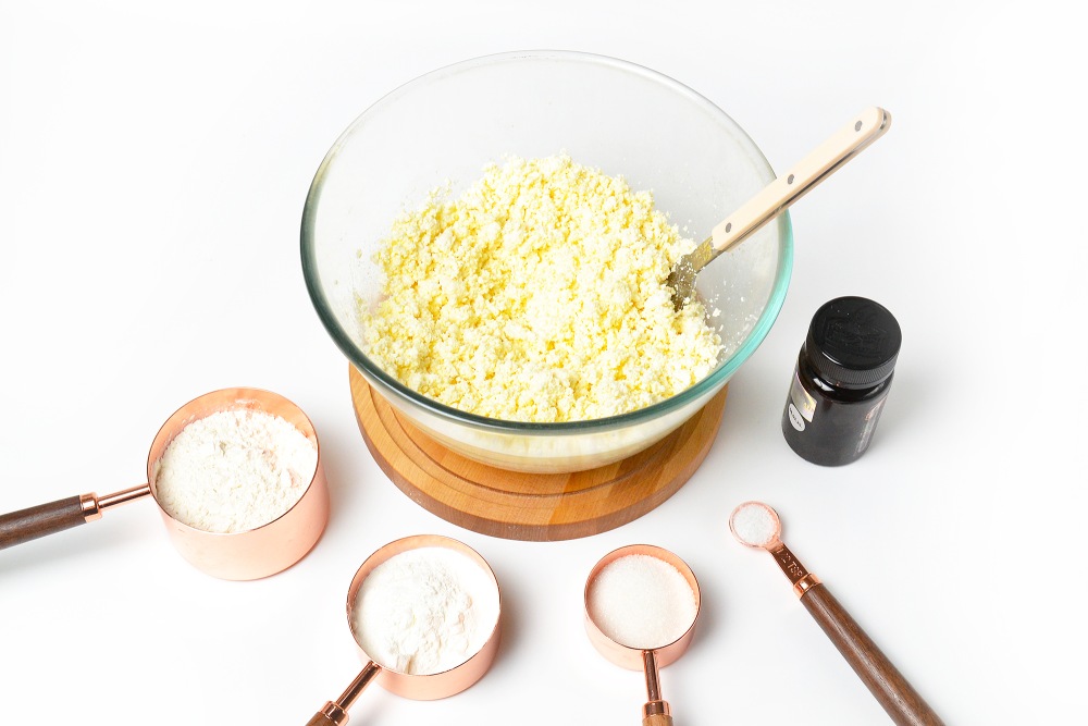 Добавить сахар, примерно половину муки, крахмал, соль и ванильную пасту.