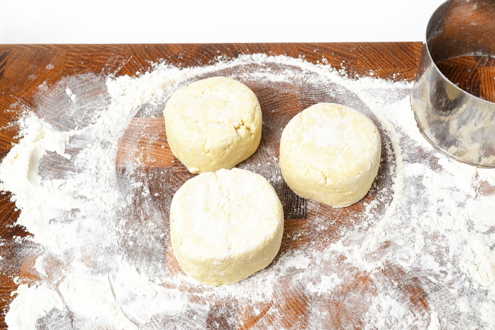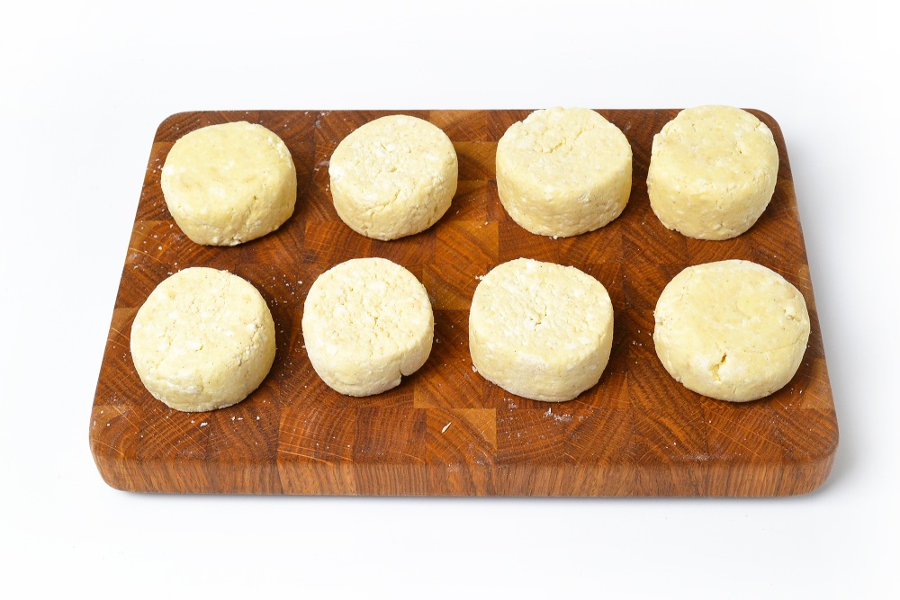 Обвалять с двух сторон каждый сырник в муке и придать форму с помощью кулинарного кольца или широкого стакана.
