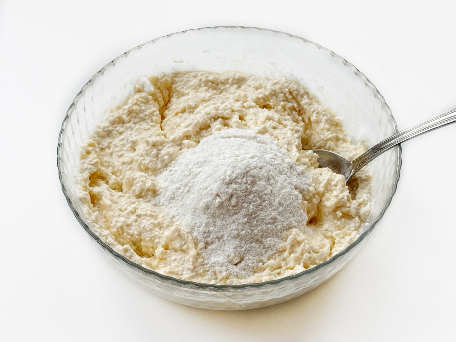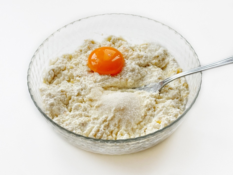 Муку добавлять постепенно, чтобы не пересушить творожную массу.