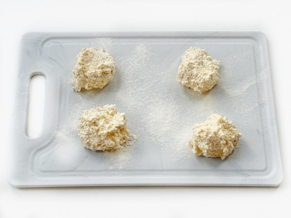 Выложить столовой ложкой творожную массу на поверхность, присыпанную мукой.