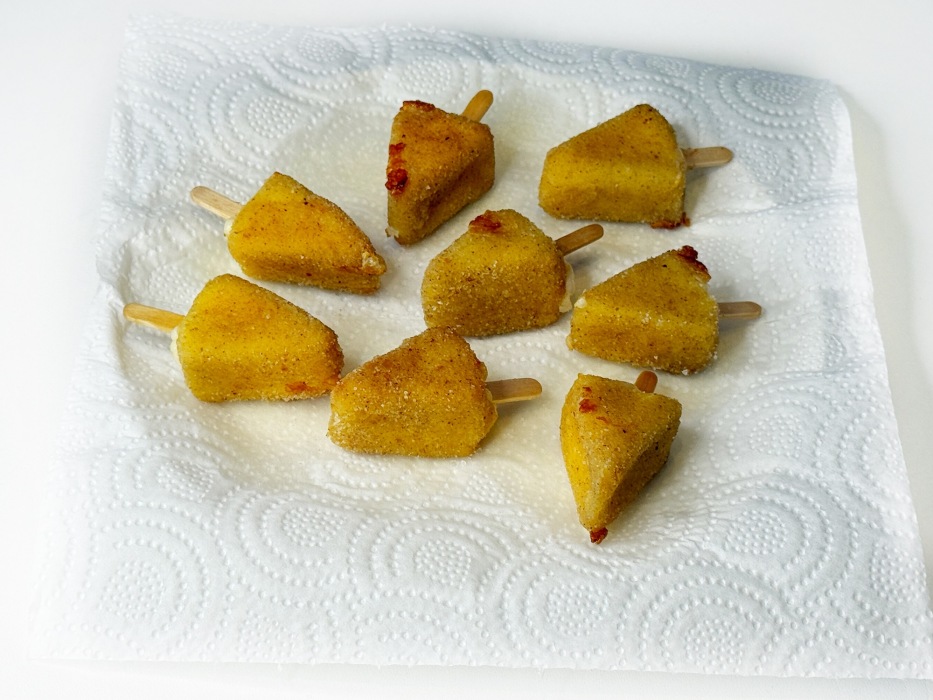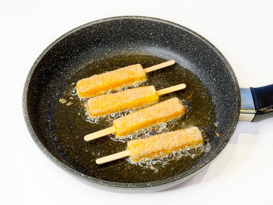 -Использование деревянных палочек или шпажек. Если воткнуть в каждую палочку короткую деревянную шпажку, весь процесс от панировки до жарки станет удобнее. Особенно если вы готовите партию для гостей.