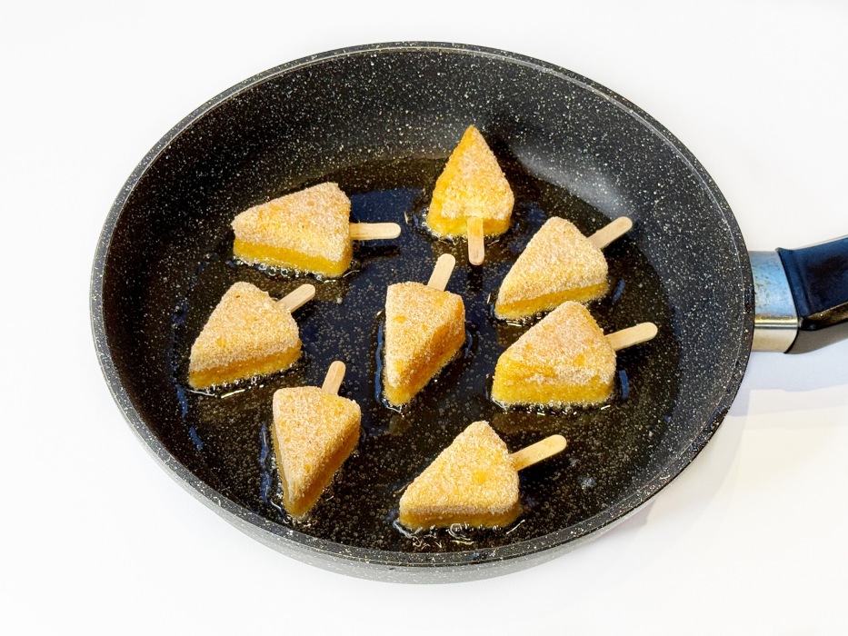 Разогреть масло, выложить брусочки сыра в сковороду на расстоянии и жарить по 30–40 секунд с каждой стороны до золотистой корочки.