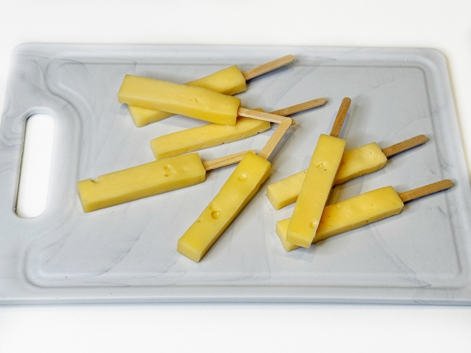 Для удобства стоит заранее приготовить деревянные палочки для сыра и воткнуть их в заготовки до заморозки. Так удобнее будет панировать, а затем обжаривать в кипящем масле.