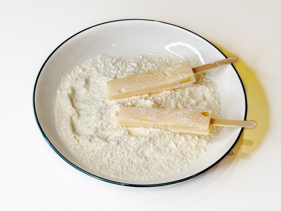 Обвалять по очереди оба вида сыра в муке.