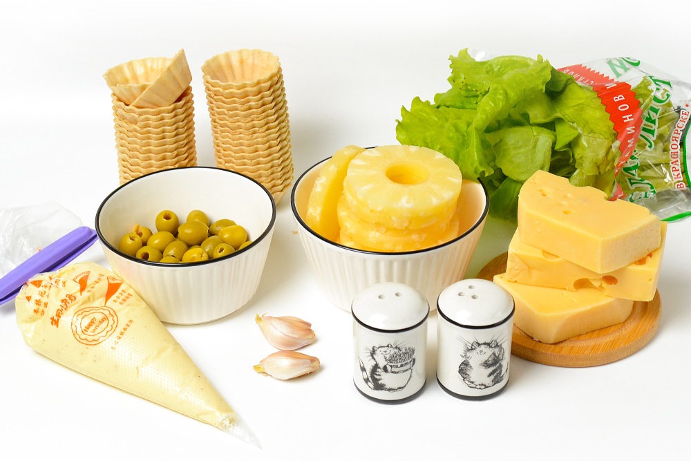 Подготовить ингредиенты: 25-30 тарталеток, консервированные ананасы, сыр, майонез, чеснок и оливки. Я использую вафельные тарталетки с верхним диаметром 5 см. Также потребуется свежий салат с нейтральным вкусом. Очень хорошо получается с айсбергом – его нежный хруст идеально дополняет такое угощение.