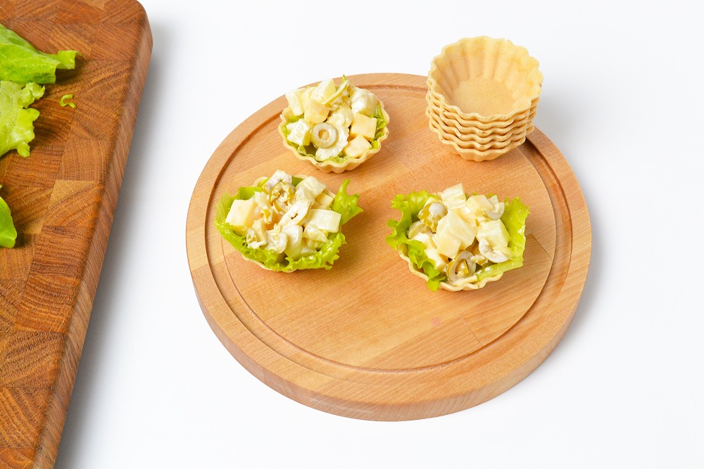 – Если не хотите класть салатные листья, берите песочные тарталетки – они дольше не размокают.