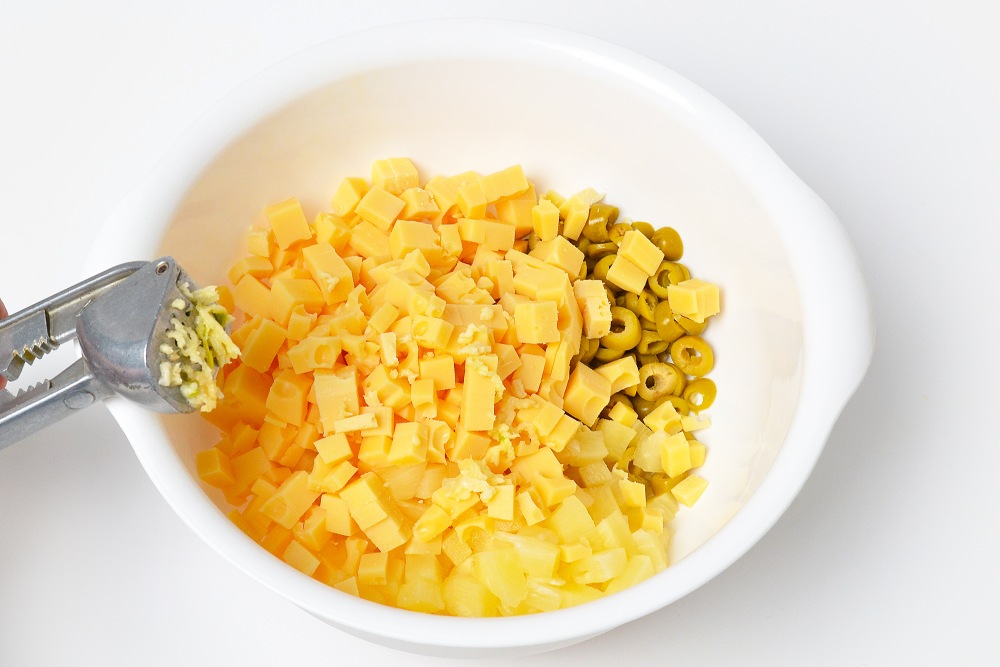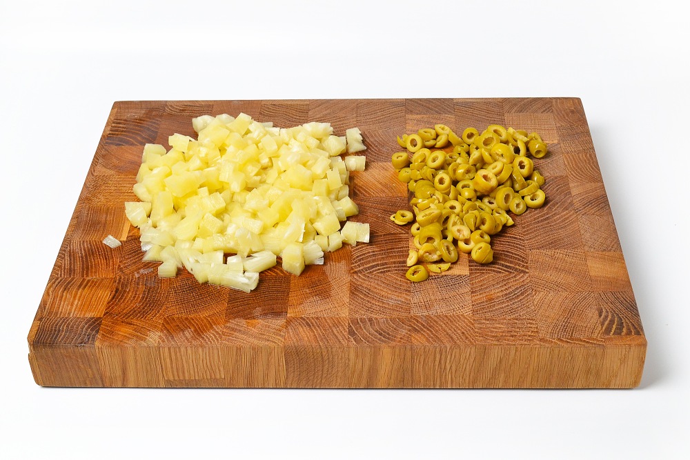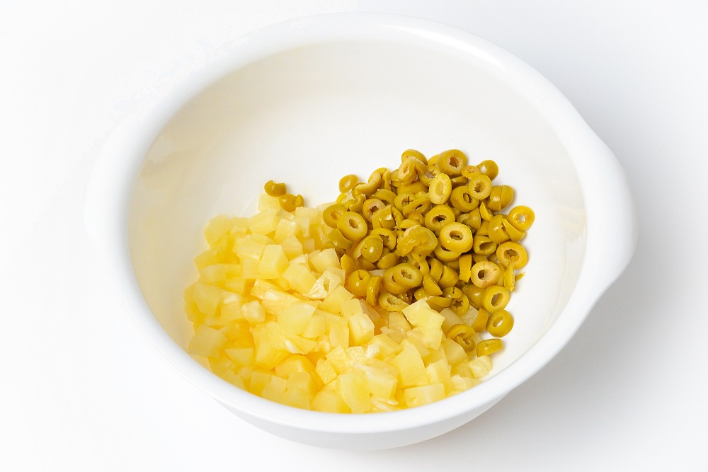 Совет: перед приготовлением слейте жидкость с оливок и ананасов, откиньте их на сито или дуршлаг, а затем просушите бумажными полотенцами.
