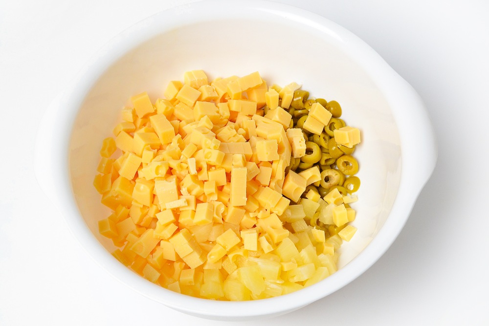 Смешать оливки и ананасы в миске.