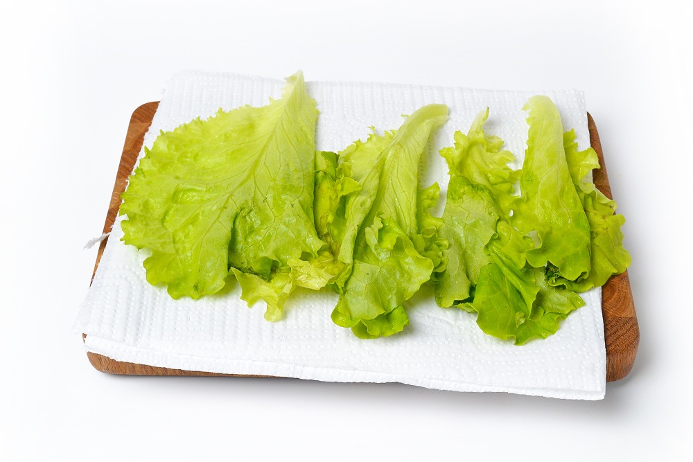 Салатные листья отделить от черенка, промыть и обсушить. Можно оставить на несколько минут на бумажном полотенце.