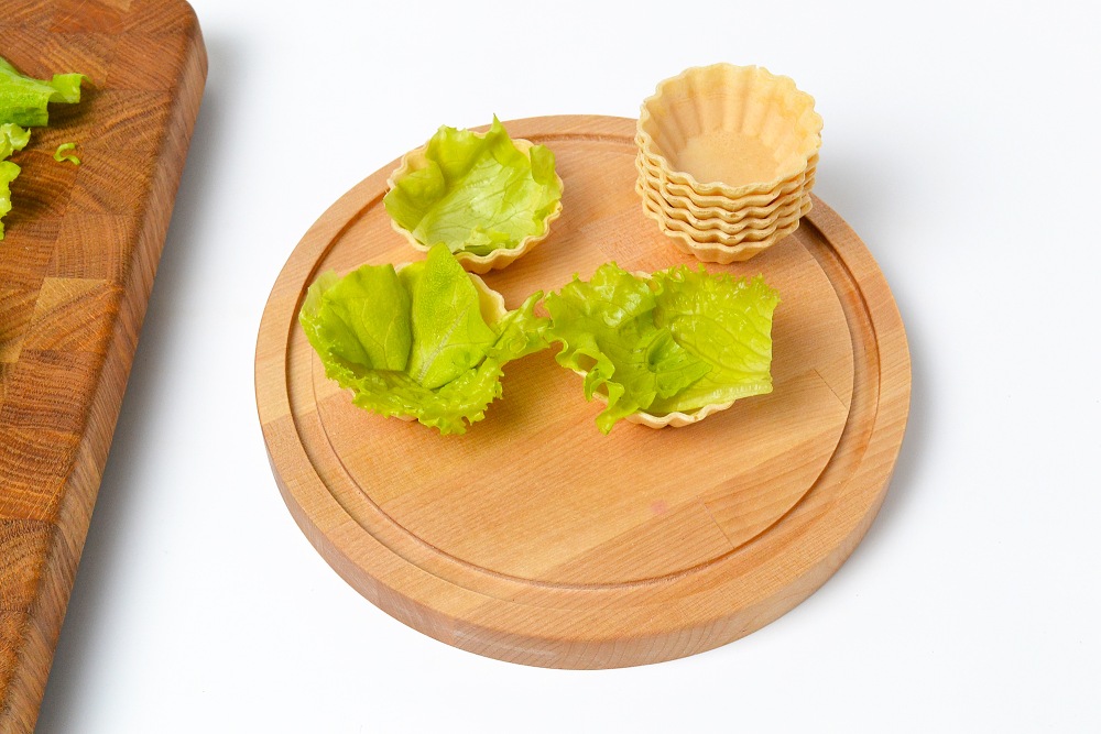 Для удобства листья разрезать на кусочки по 4-6 см и уложить в тарталетки по 2-3 штуки внахлест. Обратите особое внимание на то, чтобы было закрыто дно и стенки – чем меньше начинка будет с ними соприкасаться, тем дольше тарталетки сохранят форму.