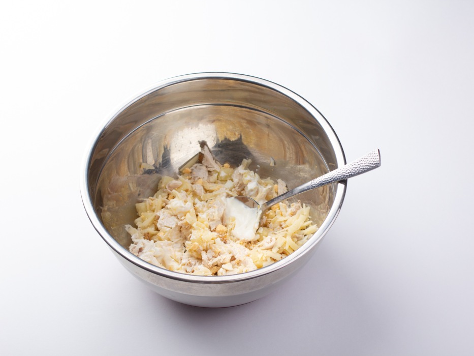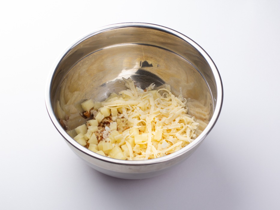 Куриное филе лучше отварить заранее и полностью остудить — так его проще нарезать аккуратными кубиками, и салат не будет тёплым. Сыр для этого рецепта стоит выбирать твёрдый или полутвёрдый: российский, гауда, эдам, тильзитер.