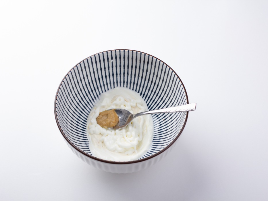 Сметану положить в миску, добавить горчицу и все тщательно перемешать.