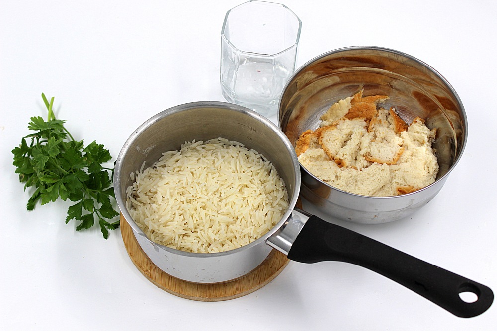 Отварить до полу готовности рис, примерно 5-7 минут. Батон покрошить и залить водой.