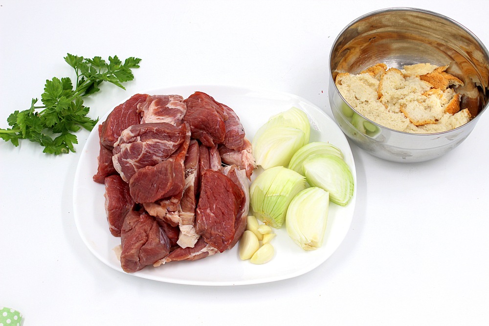 А сейчас просто пропустить через мясорубку: мясо, лук, чеснок, размоченный батон и петрушку.