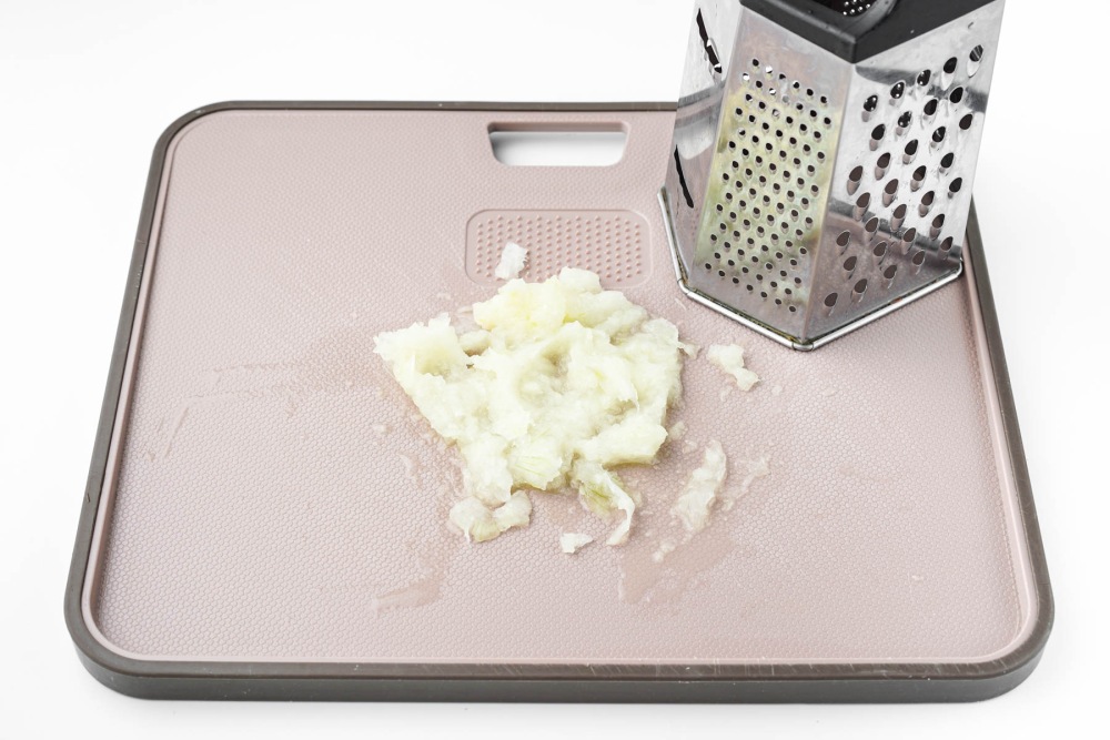 Натереть лук на мелкой тёрке или измельчить в блендере до состояния пюре.