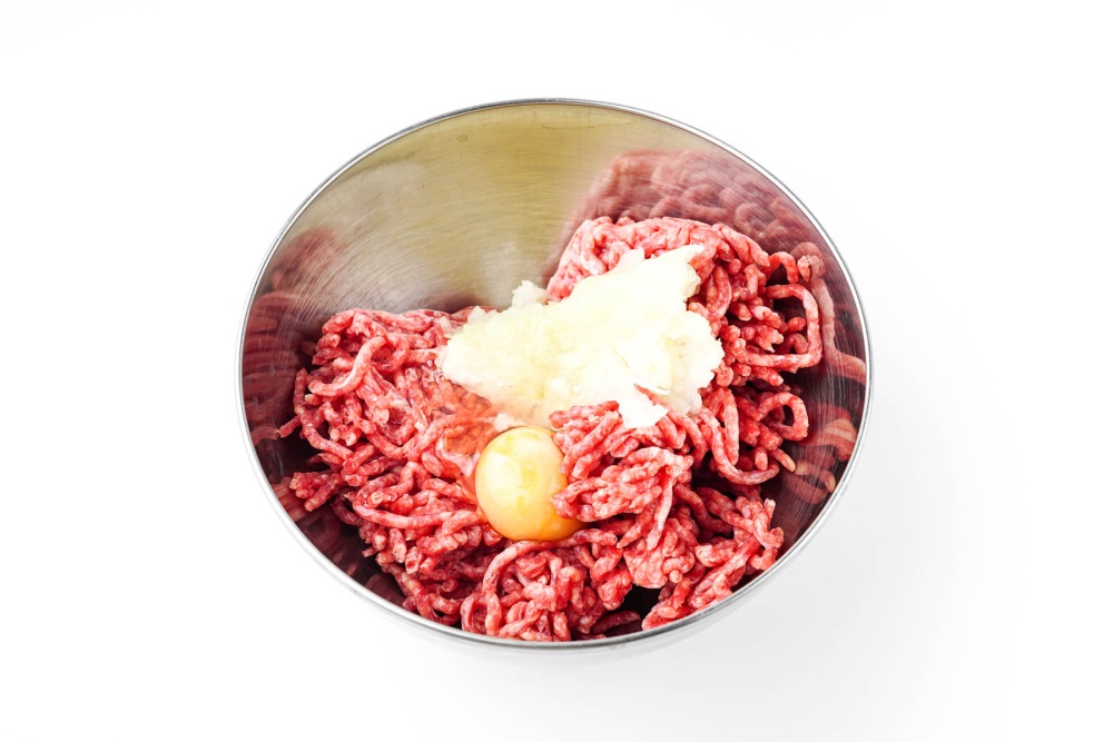 Выложить фарш в глубокую миску. Добавить к нему луковое пюре и разбить одно яйцо. Тщательно перемешать руками или ложкой, разминая комочки, чтобы масса стала однородной.