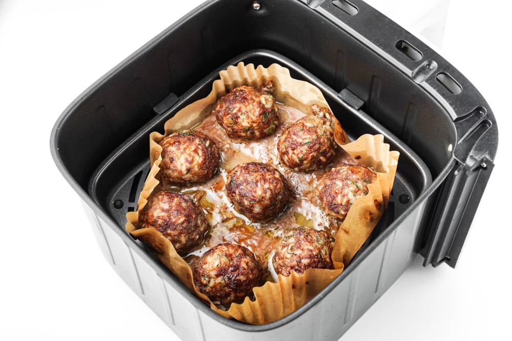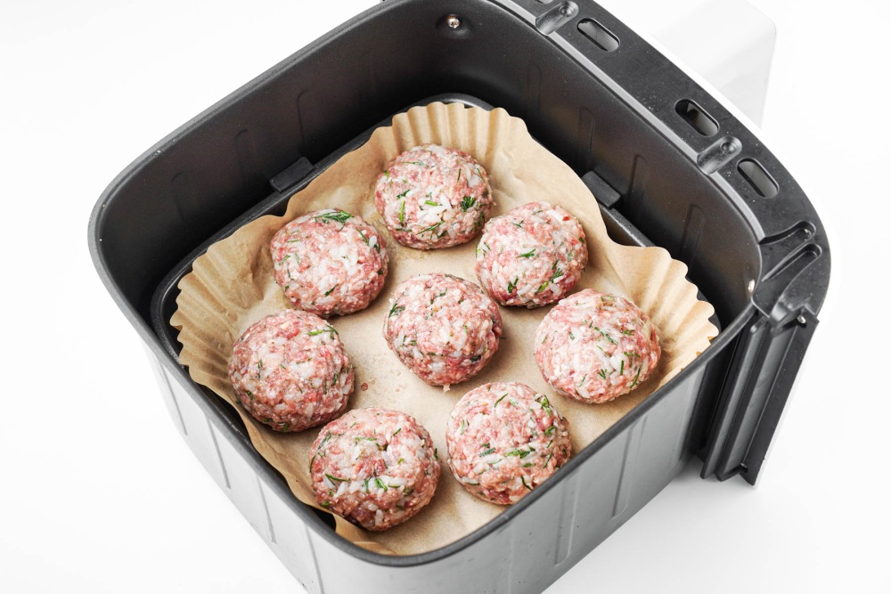 Застелить чашу аэрогриля пергаментной бумагой или использовать специальную форму. Выложить тефтели на небольшом расстоянии друг от друга. Убедиться, что между ними есть место для циркуляции воздуха.