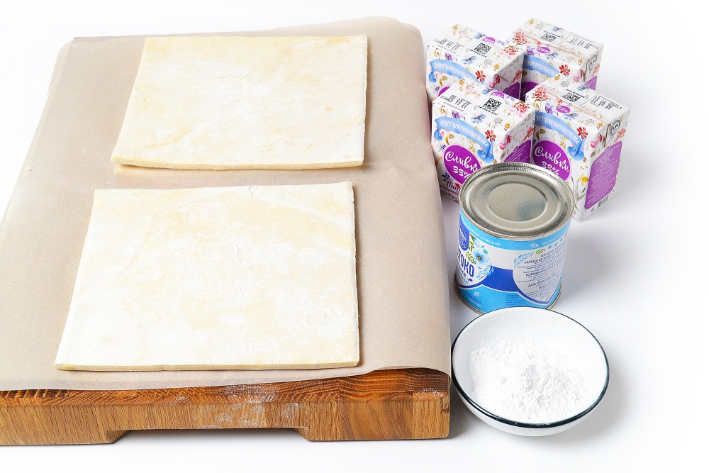 Подготовить ингредиенты: слоеное тесто разморозить заранее, а сливки и сгущенку охладить, также потребуется сахарная пудра.