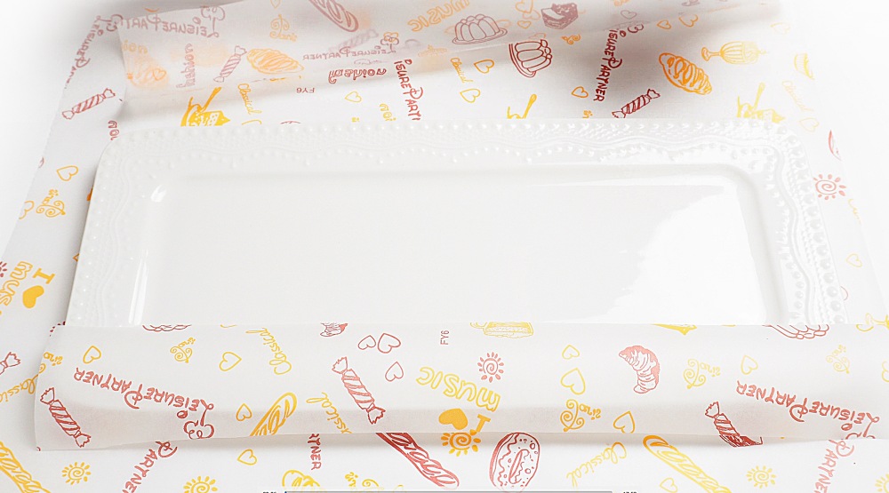 Вечером, за 2-3 часа до праздника, торт достать из холодильника. На стол положить большой лист пергамента, с которого удобно будет стряхивать крошки. Подобрать подходящую по размеру тарелку. У меня прямоугольное блюдо длиной 33 см. На блюдо положить тонкие полоски пергамента, чтобы тарелка осталась чистой после украшения.