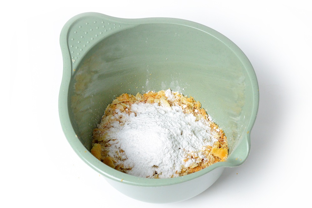 Оставшиеся палочки(штук 7-8) разломать руками в миску. Туда же добавить 1-2 ст. л. сахарной пудры и тщательно перемешать. Пудра нужна для того, чтобы посыпка стала вкуснее.