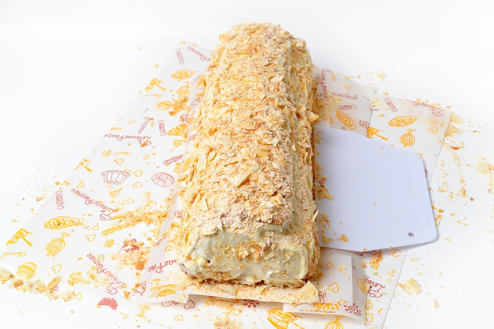 – Торт можно не формировать в виде полена, а просто выложить его слоями в красивую керамическую или стеклянную форму. После пропитки слои с легкостью разрезаются ножом и кусочки достаются широкой металлической лопаткой.