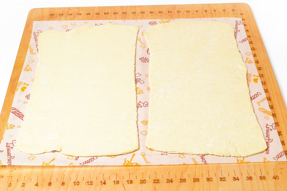 Размороженное тесто раскатать в пласты толщиной около 3-4 мм, длина должна быть по ширине противня. У меня вышло чуть меньше 35 см.