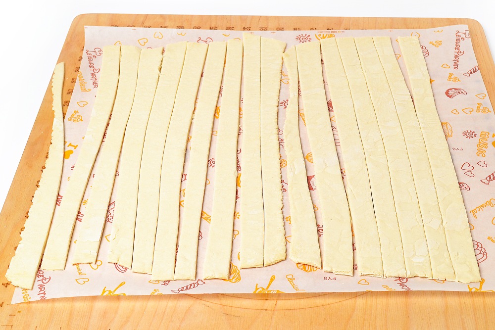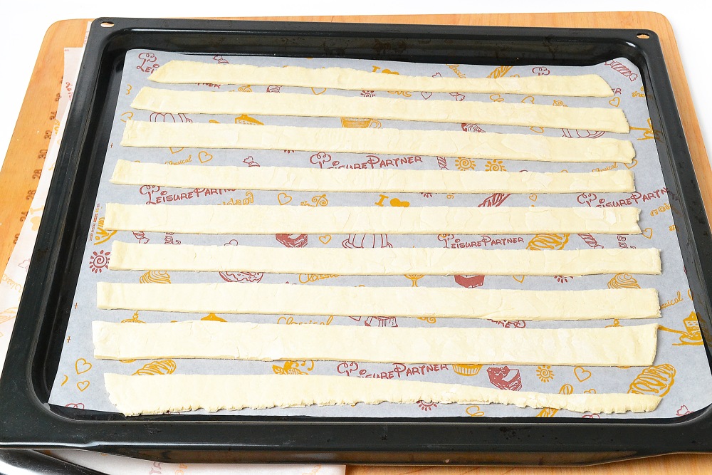 С помощью ножа или специального колеса для нарезки пиццы разрезать тесто на полоски толщиной 1,5-2 см максимум.