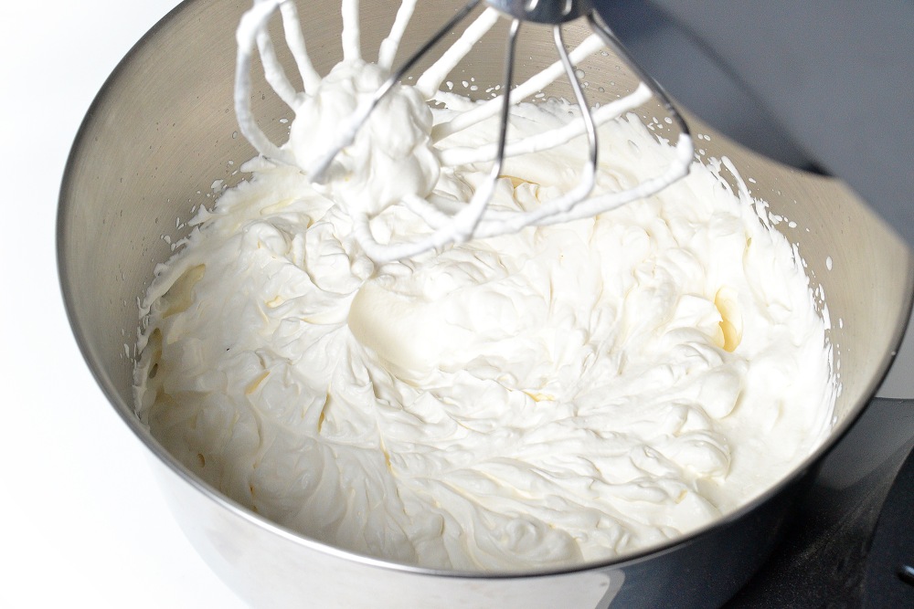 Начать взбивать сливки на оборотах чуть выше минимальных (2/6 для планетарного миксера). Через 2 минуты мощность увеличить до 4/6. Когда венчик начнет оставлять следы, перейти на максимальные обороты и взбивать до пышности. Сливки будут держать форму, но не будут такими плотными, как белки. В этом рецепте лучше немного недостаточно взбить, чем перебить сливки.