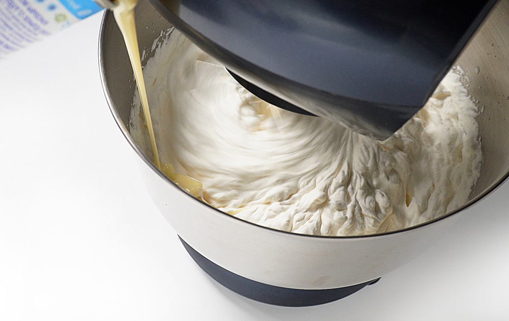 Влить охлажденное сгущенное молоко к сливкам, включив минимальную скорость миксера. Когда все молоко будет влито, перемешать еще 5-10 секунд на средних оборотах.