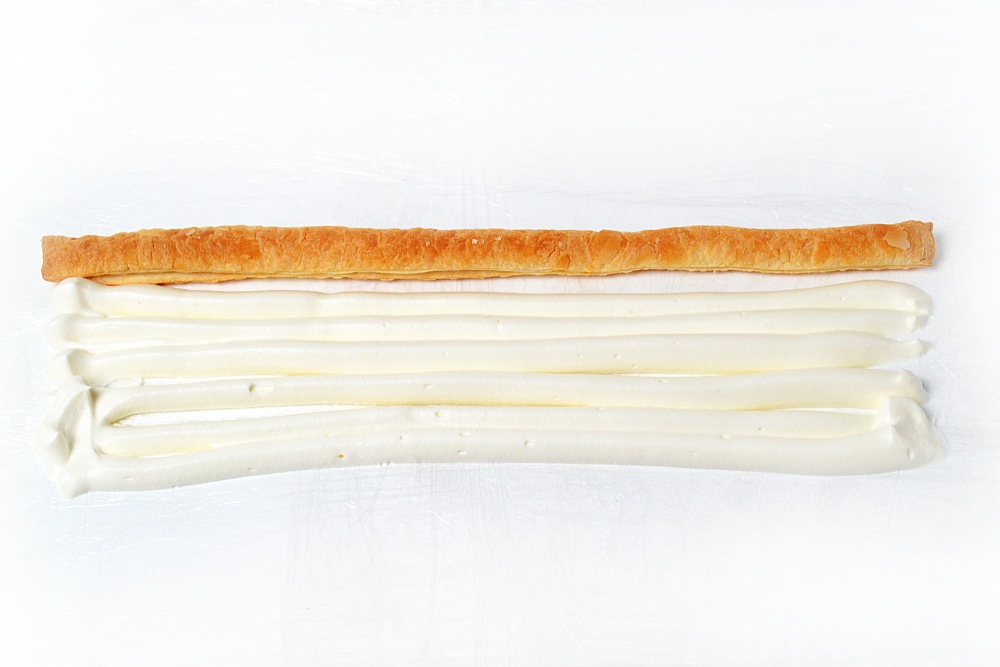 Подготовить ингредиенты для торта «Полено» из слоеного теста для праздничного стола. Из указанных ингредиентов получается торт длиной 32-33 см. Очень важно выбрать вкусное слоеное тесто. Отдавайте предпочтение маркам, в которых вы уверены. Иначе результат может разочаровать. Для рецепта лучше использовать слоеное пресное тесто, не дрожжевое. С дрожжевым, скорее всего, получится более рыхлая конструкция. Не имеет значения, сколько кусков теста будет в упаковке. Тесто нужно достать за 2-3 часа до готовки, чтобы оно оттаяло. Разложить его на столе или досках, накрыть пергаментом и полотенцем, чтобы не подсыхало.