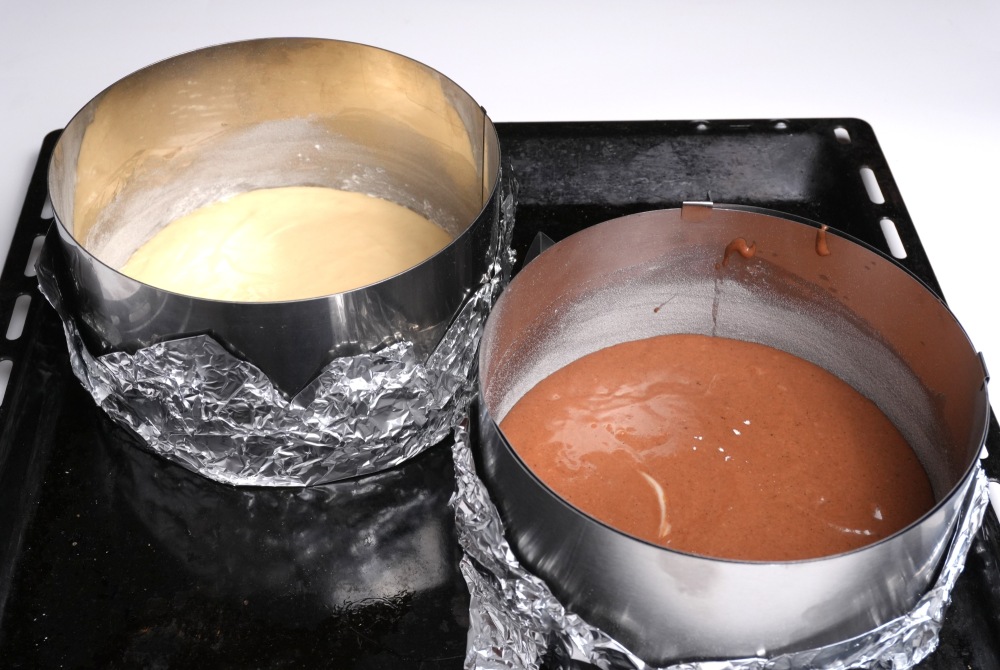 Шоколадное тесто вылить во вторую форму и отправить обе формы выпекаться в разогретую до 170 градусов духовку на средний уровень, режим верх-низ на 20-25 минут.