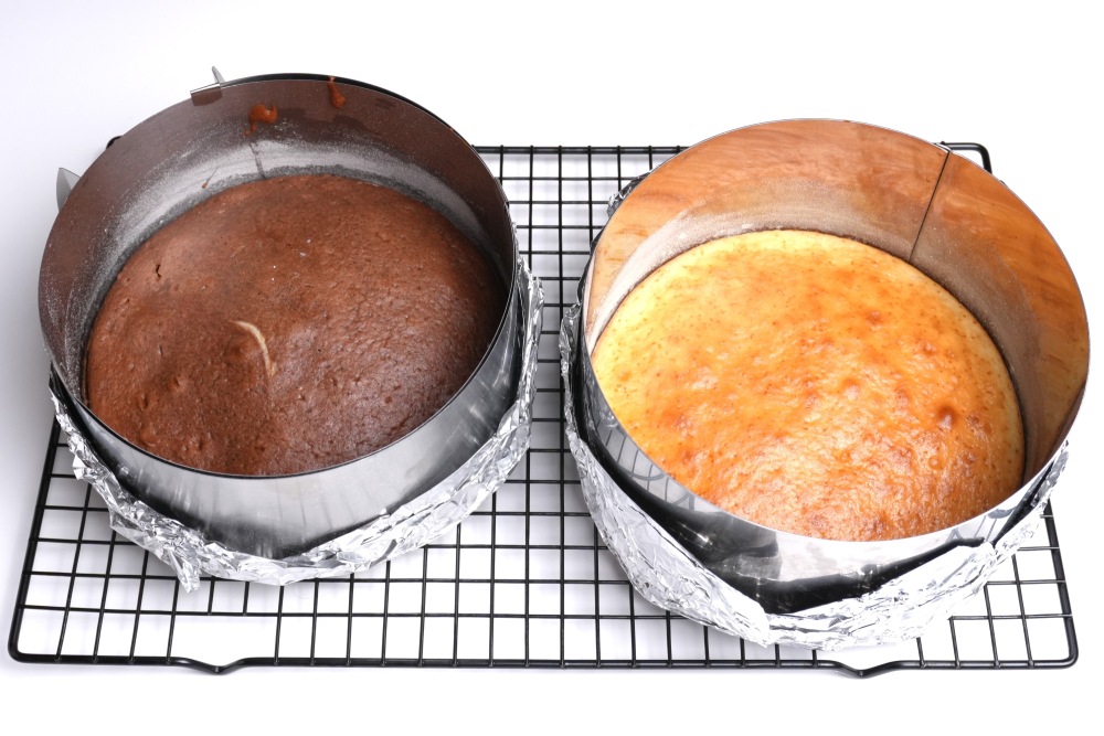Шоколадное тесто вылить во вторую форму и отправить обе формы выпекаться в разогретую до 170 градусов духовку на средний уровень, режим верх-низ. По времени 20-25 минут. Первые 15 минут духовку лучше не открывать, чтобы коржи не опали. Если верх начал подгорать, накройте его фольгой. Проверить готовность коржей можно сухой палочкой - она должна выходить сухой.