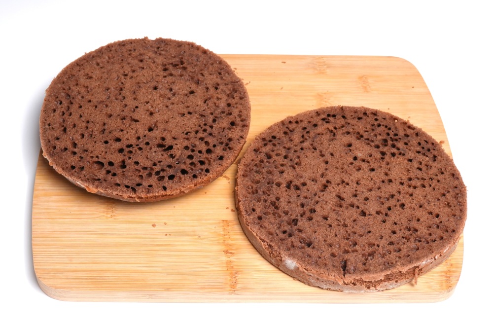 Остывшие коржи разрезать на 2 части, срезать выпуклые верхушки.