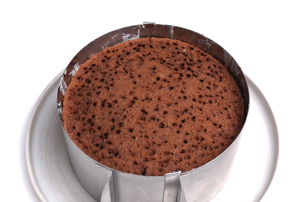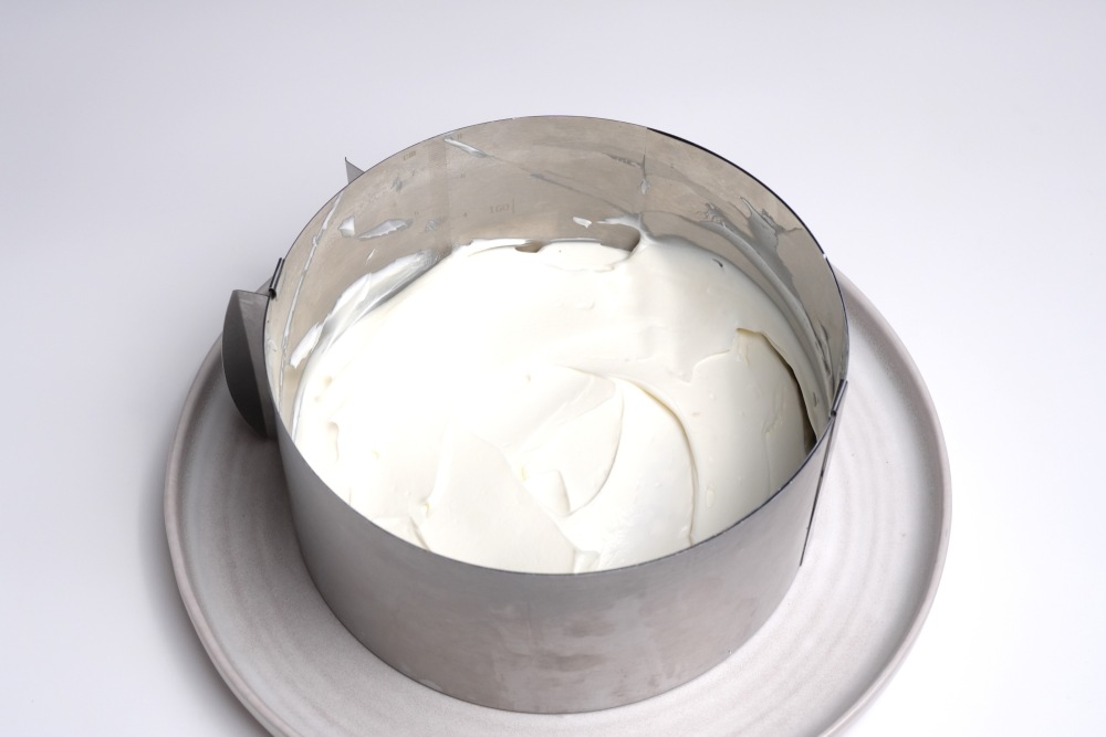 Собирать торт в кольце, на корж понадобятся примерно 2 столовые ложки крема. Оставьте 4 столовые ложки крема для финальной обмазки торта.