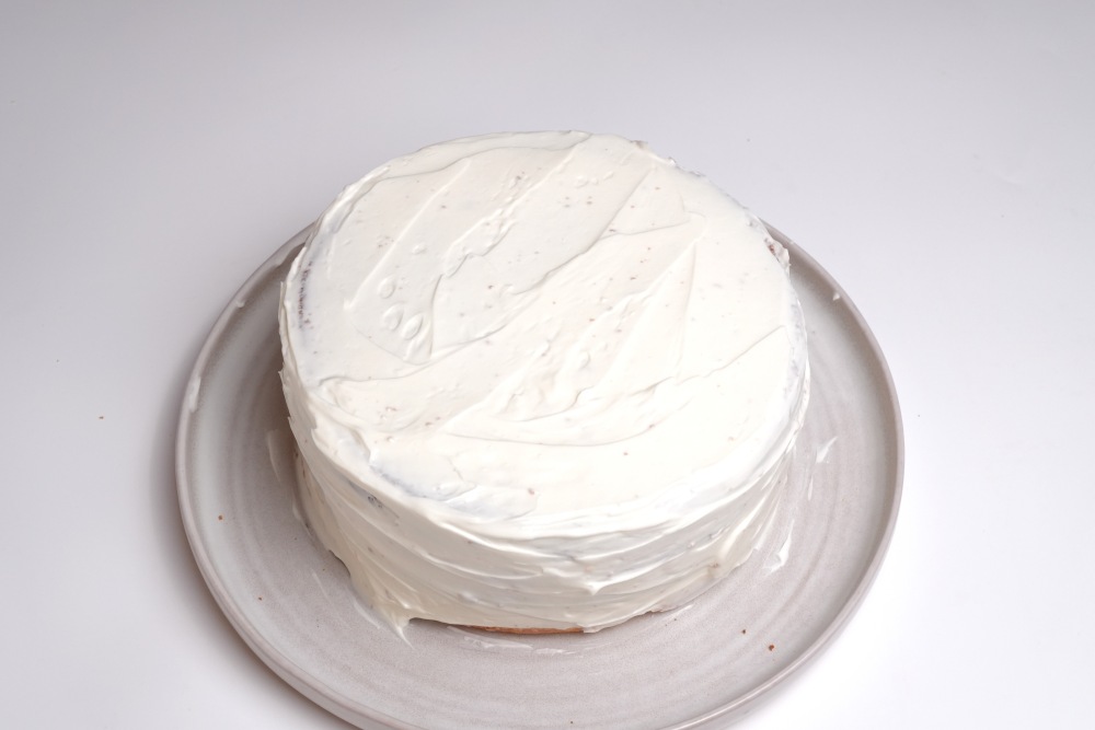 Собирать торт удобнее всего в кольце и сразу на плоском блюде, на котором будете его подавать. На корж понадобятся примерно 2 столовые ложки крема, распределите его по всей поверхности. Оставьте 4 столовые ложки крема для финальной обмазки торта.